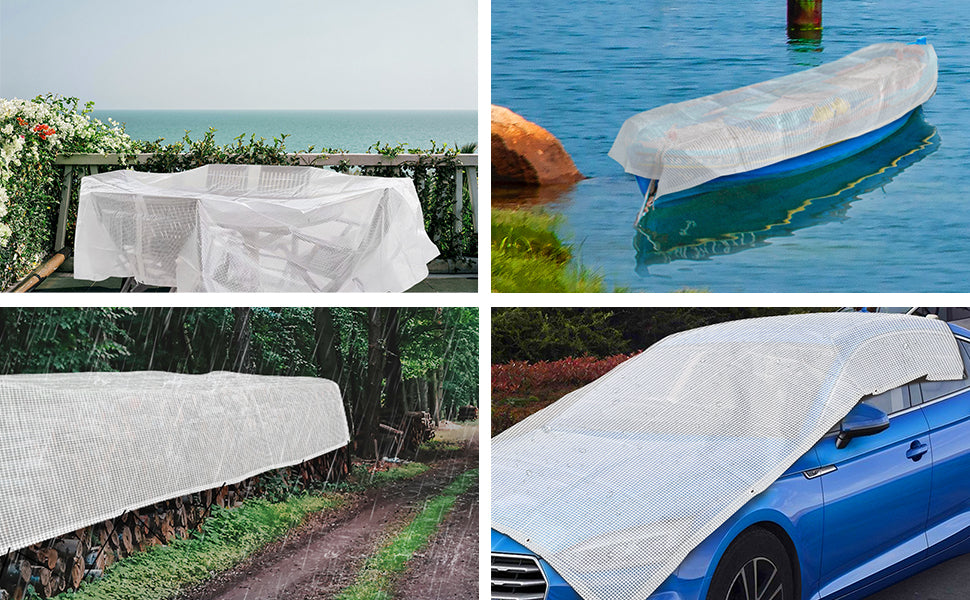 VOUNOT Abdeckplane Premium | Gewebeplane | Schutzplane | LKW Plane | Allzweckplane | Zeltplane | Bauplane | Gartenplane | Bootsplane — BESTÄNDIG & STABIL — Die wasserdichte Plane aus 180g /m² PE-Gewebe und ist dank der verstärkten Ecken mit Gummikanten und des an allen Kanten mit doppeltem Material umnäht ist die Abdeckplane extrem reißfest. — UV-SCHUTZ UND WETTERFEST — Unsere transparente weiße Plane bietet optimalen Schutz bei allen Wetterbedingungen. Sie besteht aus hochwertigen Materialien und ist äußerst widerstandsfähig gegen Risse, starken Wind, Regen, Schnee, Staub und schädliche UV-Strahlen. Dank ihrer weißen Farbe fügt sich diese Plane harmonisch in die Umgebung ein und passt zu jeder Art von Außendekoration. — VIELSEITIG EINSETZBAR — Geeignet für Außen- und Innenbereich. Sie kann Ihre Autos, Motorräder, Anhänger, Boote, Holzstapel, Gartenmöbel, Swimmingpools usw. vor Staub schützen und kann auch als Zeltunterlage verwendet werden. — EINFACHE HANDHABUNG — Dank einer rostfreie Aluminium-Öse alle 100 cm lässt sich die Allzweckplane leicht an irgendeinem Ort befestigen. Wenn sie nicht gebraucht wird, können Sie sie waschen, an der Luft trocknen lassen und zur Aufbewahrung zusammenfalten, ohne viel Platz zu beanspruchen.